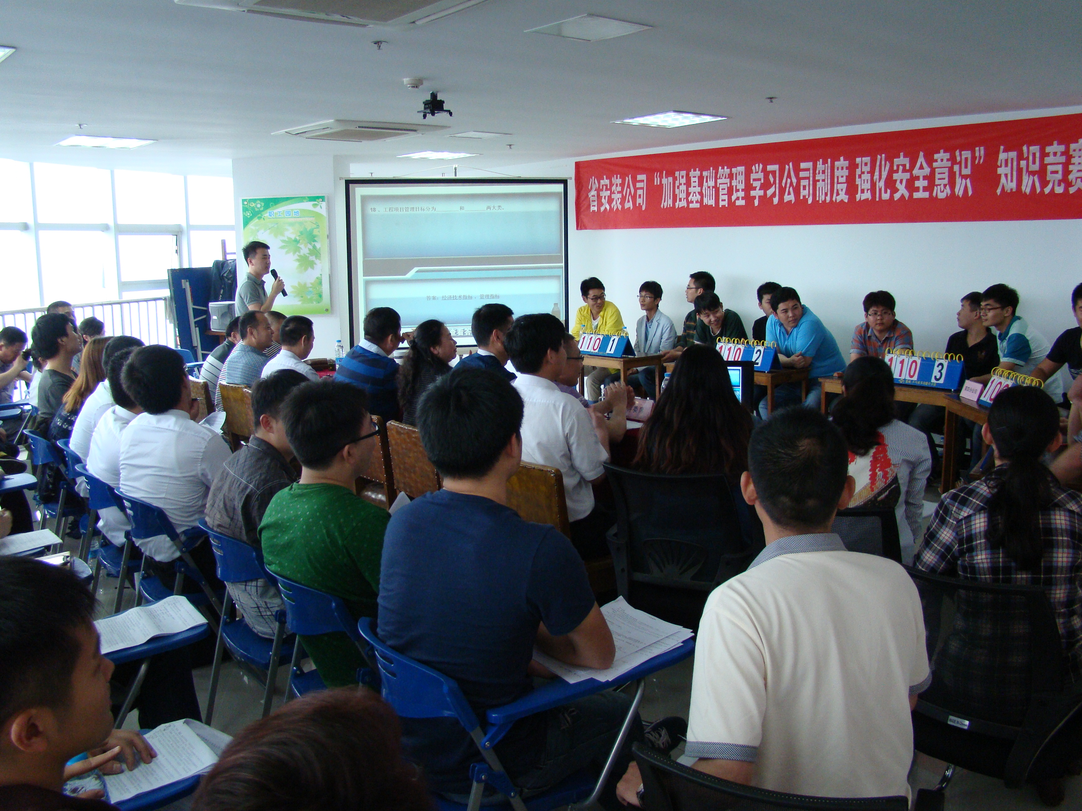 為了充分展現(xiàn)職工積極好學(xué)的精神風(fēng)貌,促進(jìn)職工掌握企業(yè)制度和專業(yè)知識(shí),激勵(lì)大家不斷學(xué)習(xí)、不斷進(jìn)步。5月15日下午,公司在職工之家舉辦了“加強(qiáng)基礎(chǔ)管理、學(xué)習(xí)公司制度、強(qiáng)化安全意識(shí)”知識(shí)競賽。公司董事長、總經(jīng)理王軍邦,黨委副書記、紀(jì)委書記胡六中,工會(huì)主席李原到現(xiàn)場觀看比賽,并為選手們鼓勁加油。