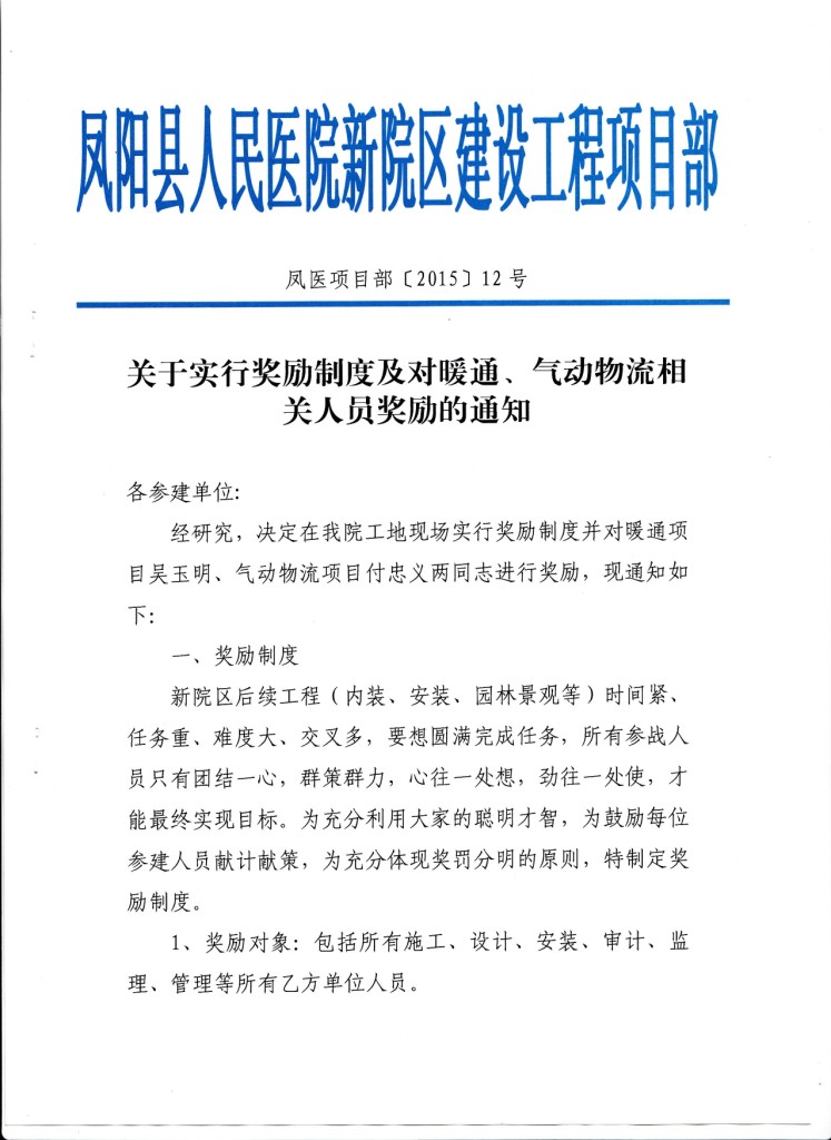 8月11日,鳳陽縣人民醫(yī)院新院區(qū)建設(shè)工程項(xiàng)目部發(fā)來賀文,就公司第九分公司承攬的鳳陽縣人民醫(yī)院新院區(qū)暖通項(xiàng)目安裝工程表示肯定,并對(duì)該項(xiàng)目的現(xiàn)場負(fù)責(zé)人吳玉明同志給予表彰和獎(jiǎng)勵(lì)通報(bào)。