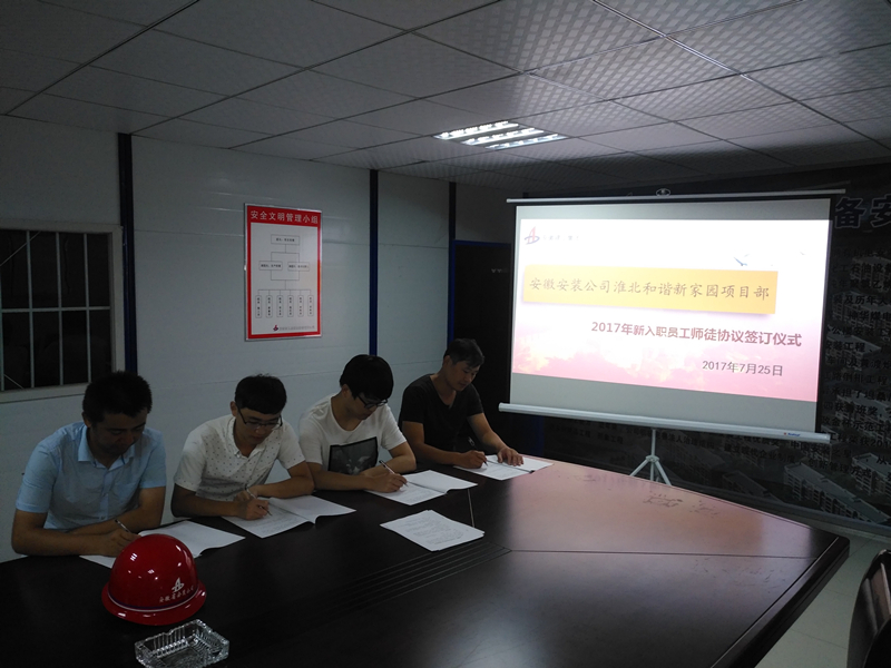 7月25日晚,安徽安裝公司淮北和諧新家園項目部精心策劃,嚴(yán)密組織,精選出思想作風(fēng)扎實,工作經(jīng)驗豐富,專業(yè)素質(zhì)過硬的老師傅與新入職員工舉行莊重的師徒協(xié)議書簽訂儀式。