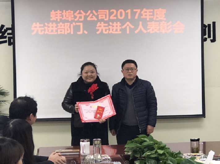 2月12日下午,蚌埠分公司舉行了2017年度員工績效考評暨先進部門、先進個人表彰會。分公司全體員工共30余人參加了此次會議。會議由分公司工會主席程茂麗主持。