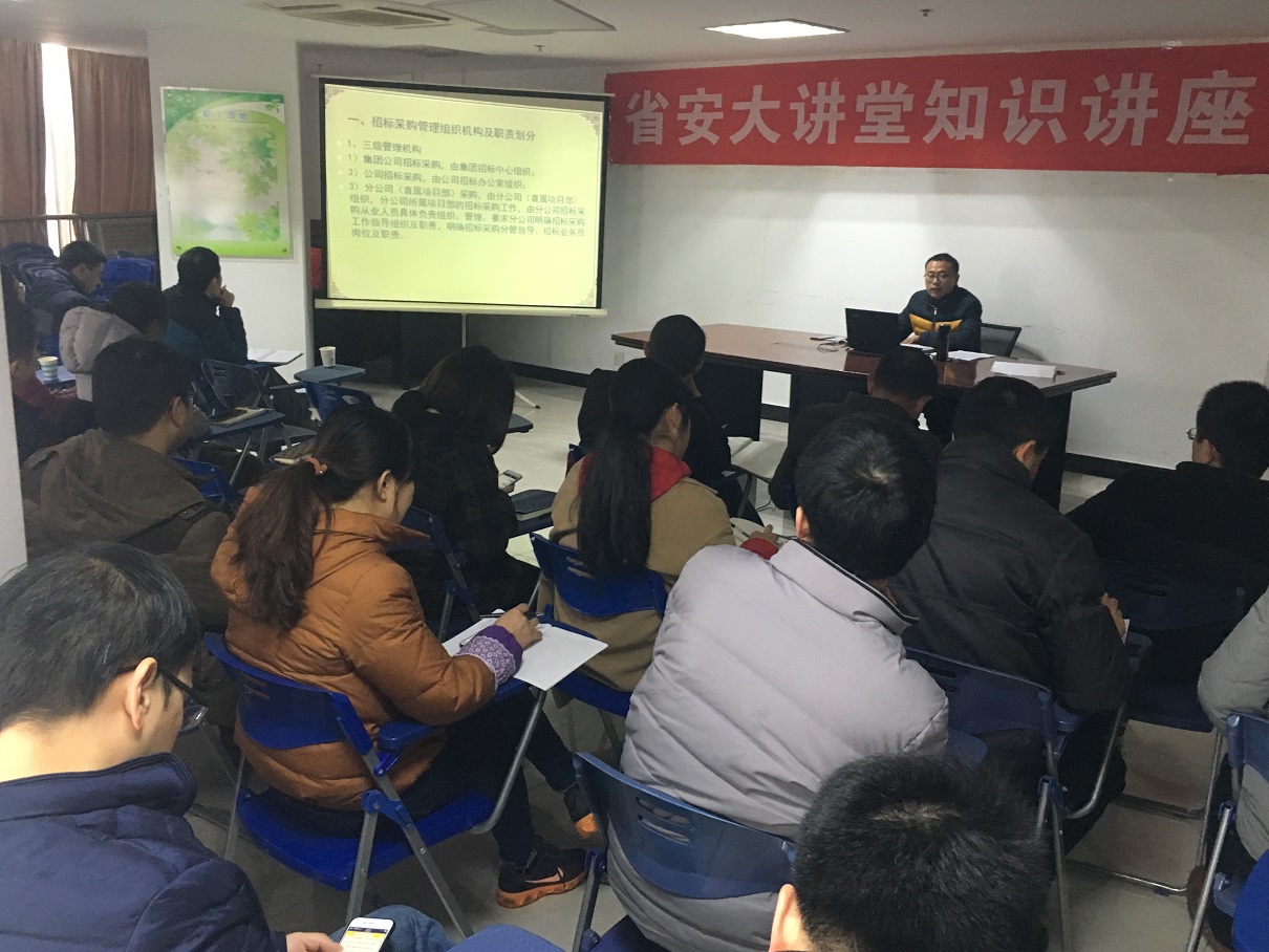 12月7日上午“省安大講堂”—招標業(yè)務(wù)培訓在職工之家開課。本次培訓由招標辦副經(jīng)理李文山授課,公司機關(guān)、分公司、項目部相關(guān)人員共30余人參加。