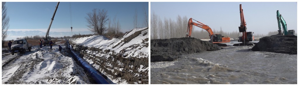 由于施工工期短,為了按時完成管道穿引洪渠任務(wù),目前,在項目執(zhí)行經(jīng)理柴琳、項目副經(jīng)理張寶深以及項目技術(shù)負責(zé)人蔡京利的帶領(lǐng)下,項目部正在堅持24小時不間斷施工;除此之外,由于施工現(xiàn)場“戰(zhàn)線長”,距離附近集鎮(zhèn)和項目部基地都較遠,項目部在河渠邊搭建兩個軍用帳篷做為施工指揮部,“冷饃硬馕加泡面”成了項目部午餐“標(biāo)配”。施工間歇,施工人員就在管溝邊用撿到的枯木點燃火堆取暖。在穿越四棵樹河施工段施工過程中,管溝挖深總共約4米,但管溝中的水深卻高達3米,由于管道安裝滿足標(biāo)高要求,即使面臨開挖出水多,施工難度大的困境,項目副經(jīng)理馬讓同志依舊毫不猶豫地召集起項目上的黨員同志,帶頭穿上雨衣皮褲,站在挖機斗中下河扶塔尺測標(biāo)高,保證管道安裝質(zhì)量。他們的身影深深地感染著項目上的每一個人。在四棵樹河中管道施工時,需要將上游河水截流,時間緊任務(wù)重,項目全體員工不喊累不叫苦,沒日沒夜加班奮戰(zhàn),搶抓施工進度......