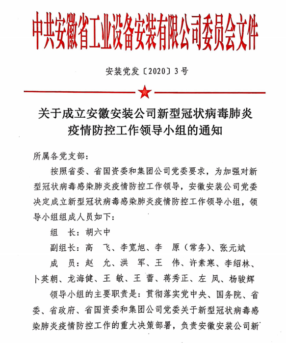 一是組織到位。1月26日,安徽安裝公司下發《關于成立新型冠狀病毒感染肺炎疫情防控工作領導小組的通知》,負責貫徹落實上級關于新型冠狀病毒感染肺炎疫情防控工作的重大決策部署,負責安徽安裝公司新型冠狀病毒感染肺炎疫情防控工作的領導,研究解決安徽安裝公司疫情防控中的重大問題,統籌組織防控處置。
