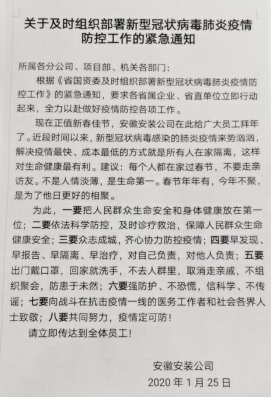 二是部署到位。疫情防控工作開展后,1月25日(大年初一)安徽安裝公司發出防控疫情工作的緊急通知,1月27日制定肺炎疫情防控措施,對疫情防控工作進行細化安排,周密部署。要求各分公司、直屬項目部、各部門要以對職工群眾生命安全高度負責的態度,精準施策,堅決遏制疫情在安徽安裝公司輸入、蔓延,鼓勵職工戴口罩、勤洗手、多通風、少走動、常消毒。