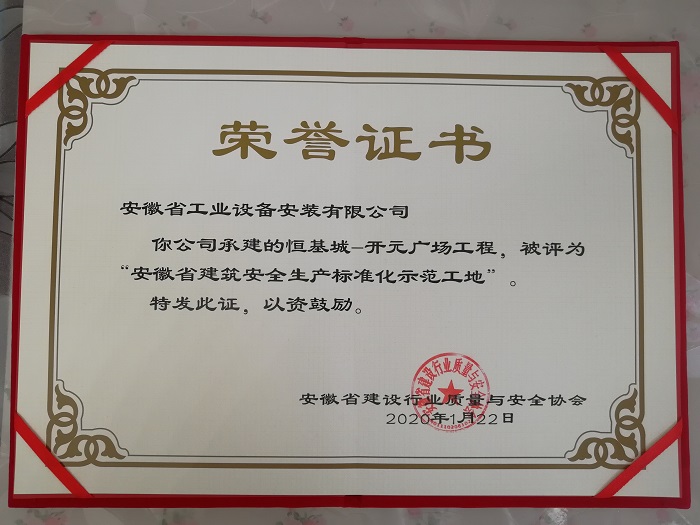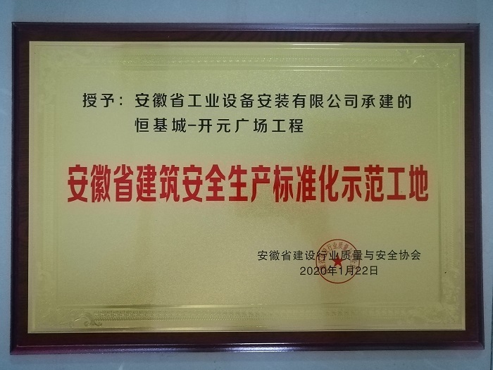 近日,安徽安裝承建的淮北恒基城開元廣場項目榮獲“安徽省建筑安全生產標準化示范工地”稱號,為公司在安全生產方面樹立了良好的企業形象。