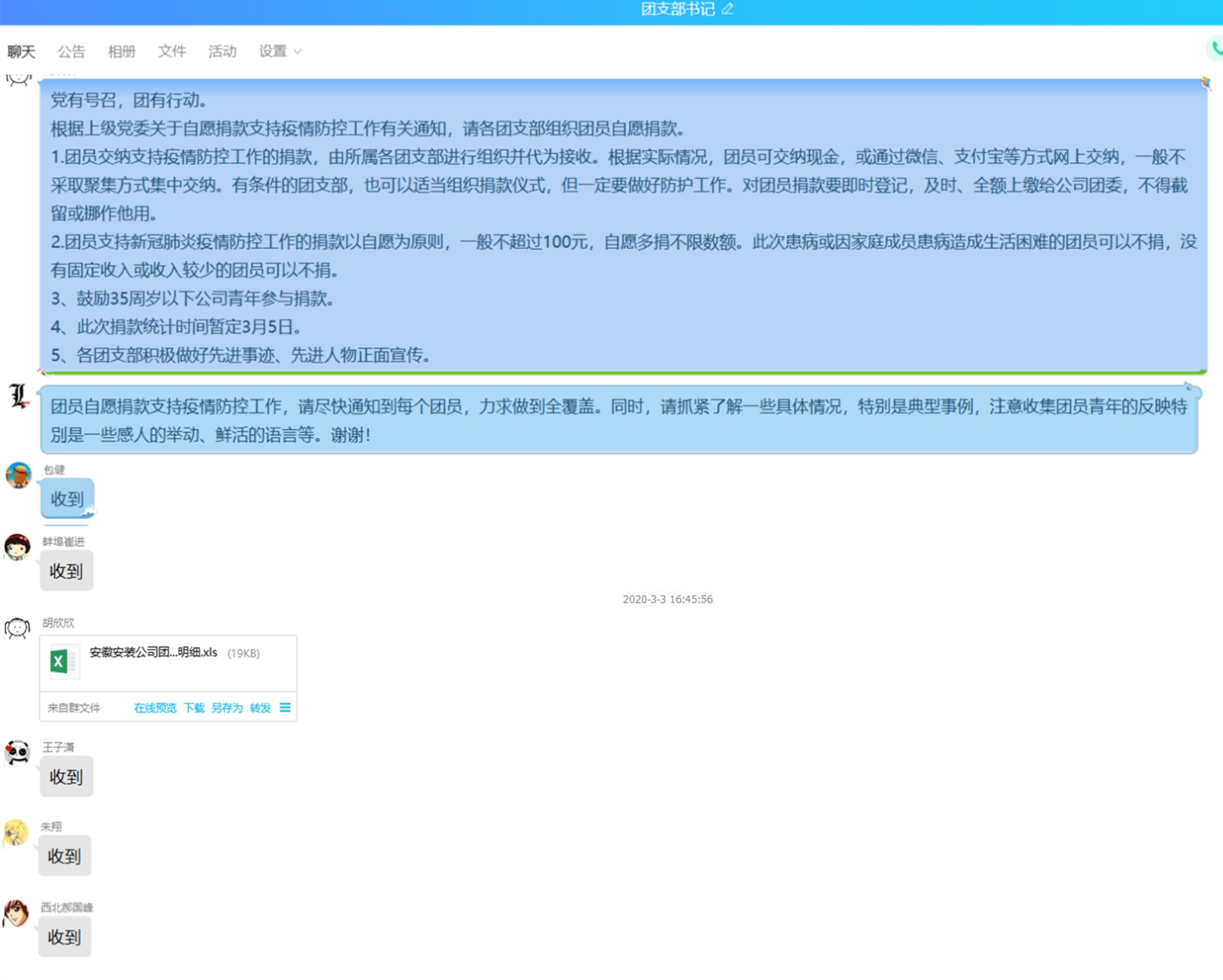 在這次疫情“抗戰(zhàn)”中,安徽安裝公司的團(tuán)員青年們?cè)诟髯缘膷徫粓?jiān)守陣地,貢獻(xiàn)力量。各團(tuán)支部書記帶頭“作戰(zhàn)”,有的積極配合社區(qū)進(jìn)行防疫登記,有的堅(jiān)守崗位做好公司防疫消毒工作,有的在項(xiàng)目一線積極進(jìn)行防疫宣傳。各團(tuán)員青年充分發(fā)揮生力軍作用,機(jī)關(guān)團(tuán)支部徐君婷給社區(qū)捐獻(xiàn)了51個(gè)N95口罩,合肥團(tuán)支部陳濤濤、馮俊、蚌埠分公司團(tuán)支部王大旭等為公司想方設(shè)法采購(gòu)防疫物資,西北分公司團(tuán)支部劉金蓮給當(dāng)?shù)丶t十字會(huì)捐款······他們以實(shí)際行動(dòng)亮身份樹形象, 當(dāng)好“戰(zhàn)斗員”,當(dāng)好“宣傳員”,助力身邊的疫情防控工作,依法科學(xué)有序參與疫情聯(lián)防聯(lián)控。