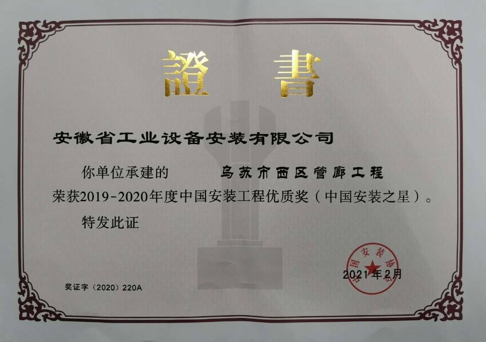 中國安裝工程優質獎(中國安裝之星)是我國安裝行業工程質量最高獎,是國家級工程質量獎項,申報這一獎項的工程應具有新穎、創新、實用性強等特點。被推薦工程均以獲得省部級優質工程獎為基礎,再優中選優,獲獎工程代表著國內安裝工程的先進技術和質量水平,為提高安裝行業工程質量水平起到了示范作用,業內人士形象稱之為“安裝工程的魯班獎”。