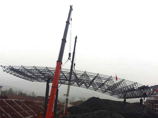 當日上午9時整,隨著吊裝負責人一聲令下,一臺75T汽車吊作為主吊吊起鋼網架一端,兩臺25T汽車吊做輔吊吊起鋼網架另一端,50噸的大鋼網架徐徐升起,經過調整、就位、固定,鋼網架終于穩穩地落在高高的鋼柱上,整個吊裝過程歷時不到1小時就安全完成。吊裝的科學合理安排、進展的有序組織得到業主和監理的贊許。