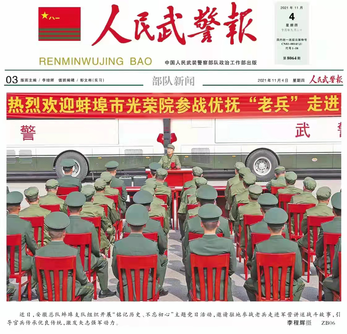 近日,《中國軍視網》《人民武警報》專題報道安徽安裝蚌埠分公司年飛同志作為參戰退伍老兵講授專題黨課。