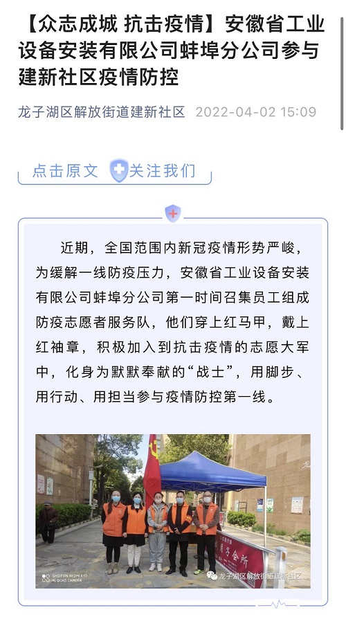 “疫情就是命令,防控就是責(zé)任”。近期,國內(nèi)省內(nèi)新冠疫情呈多點(diǎn)發(fā)生、局部暴發(fā)的態(tài)勢,疫情防控形勢嚴(yán)峻。為有效防止疫情傳播蔓延,緩解一線防疫壓力,蚌埠分公司黨支部積極號(hào)召黨員干部、團(tuán)員青年組成志愿者服務(wù)隊(duì)深入蚌埠市龍子湖區(qū)解放街道建新社區(qū)開展為期一周的疫情防控志愿者服務(wù)活動(dòng)。