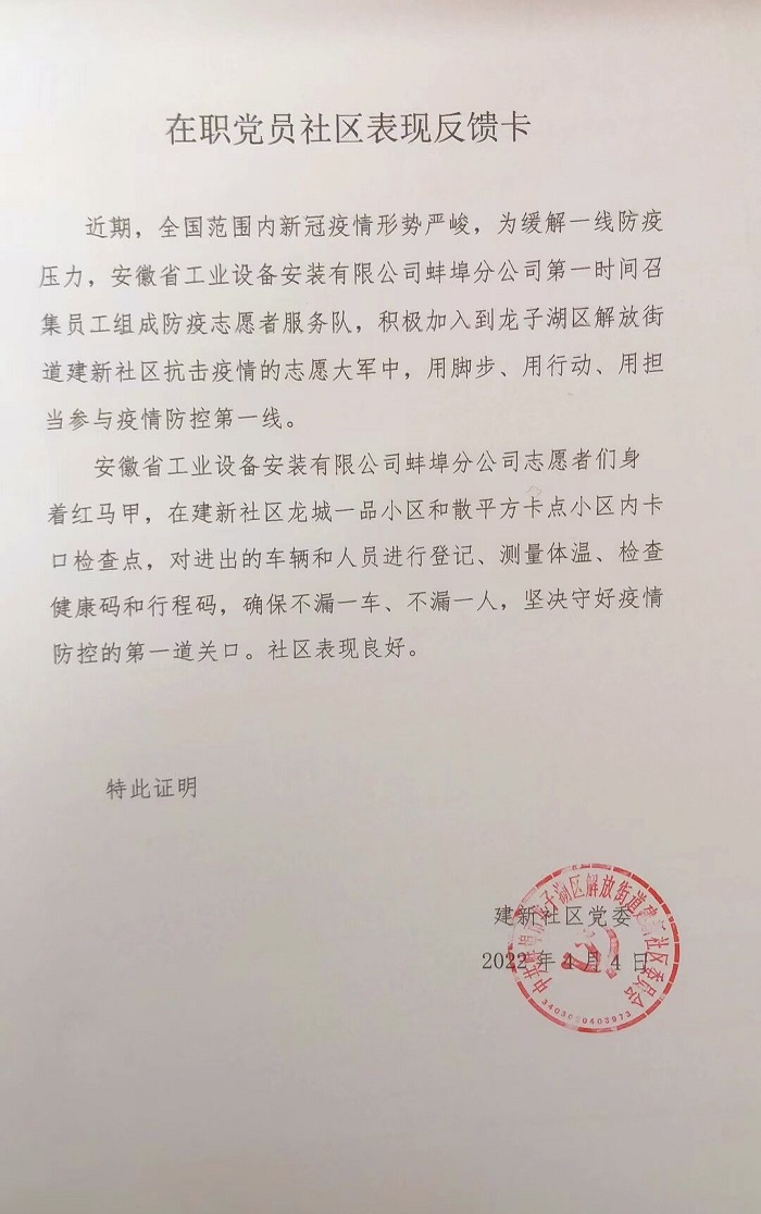 通過本次活動(dòng),志愿者們用實(shí)際行動(dòng)踐行了初心和使命,展現(xiàn)了安徽安裝志愿者飽滿的精神風(fēng)貌。建新社區(qū)黨委表達(dá)了對(duì)于安徽安裝公司的真誠感謝,期間社區(qū)及時(shí)通過微信公眾號(hào)對(duì)安徽安裝積極擔(dān)當(dāng)社會(huì)責(zé)任予以報(bào)道,有效擴(kuò)大了企業(yè)影響力,樹立了良好企業(yè)形象。