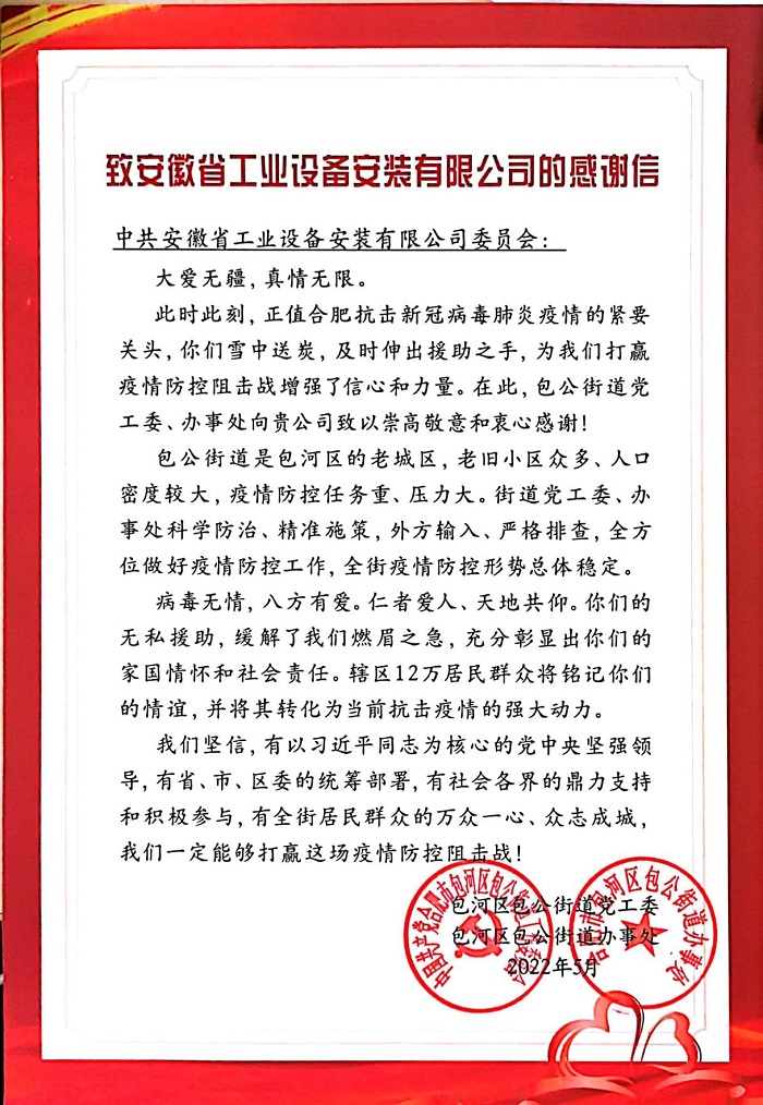 近日,包河區包公街道街道黨工委委員,辦事處副主任劉亮,包河區包公街道炳輝社區黨委書記房磊給安徽安裝公司送來了感謝信,信中表達了對安徽安裝公司在合肥抗擊新冠病毒肺炎疫情急要關頭迎難而上、勇于擔當,積極支援疫情防控的感激之情。