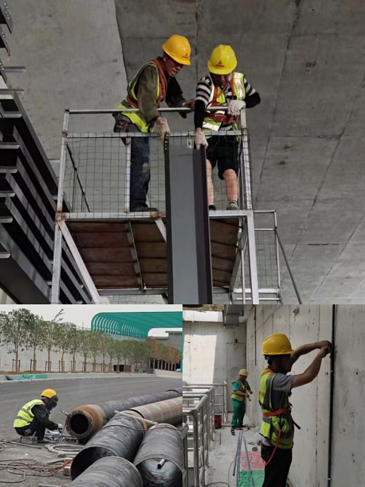 合肥分公司花園大道項目一線工人不遺余力苦干實干,汗水和膚色就是最好的見證;圖為隧道內橋架安裝、管道預制焊接及雨水泵房電氣配管施工。