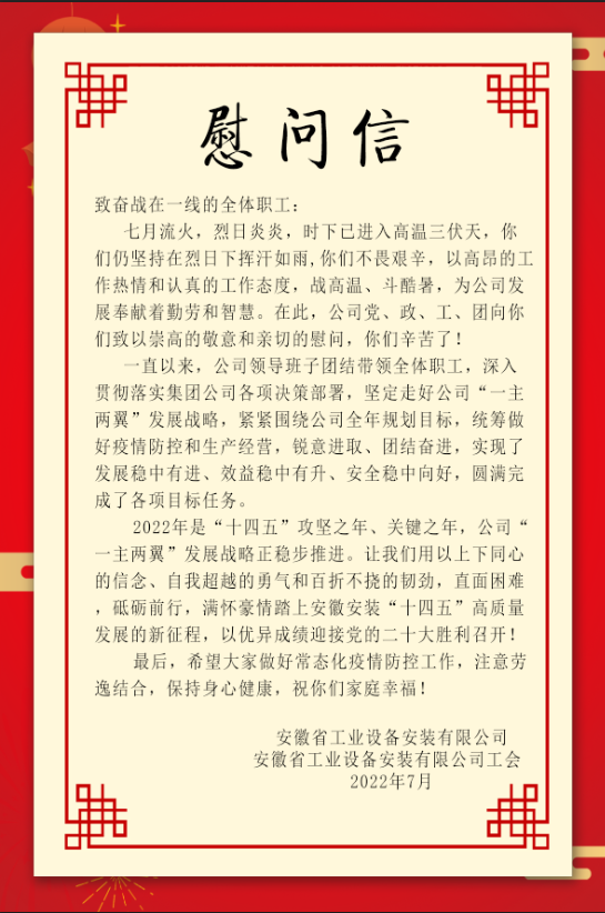為做好高溫季節(jié)勞動保護和防暑降溫工作,保障高溫天氣始終堅持在一線崗位員工的身體健康。7月-8月,安徽安裝公司工會結(jié)合職工代表巡察,到分公司在建項目開展“送清涼”活動,親切慰問施工一線員工,并為他們送去清涼和關(guān)愛。