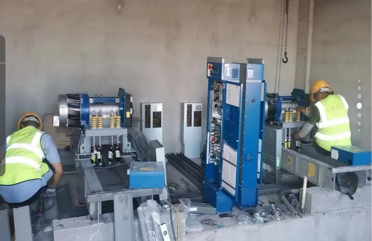 桃花科創產業園EPC總承包電梯安裝工程施工人員正在安裝電梯曳引機