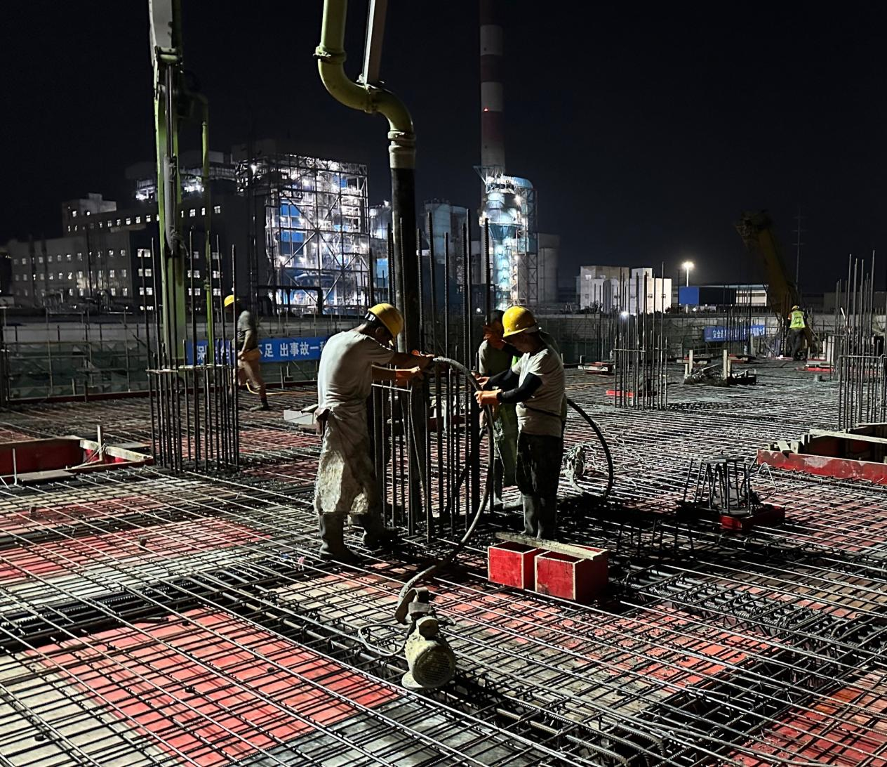 地上一層澆筑前,項目部做了精心施工準(zhǔn)備,領(lǐng)導(dǎo)班子每晚組織召開工程進(jìn)度協(xié)調(diào)會,對分包單位提出的問題,當(dāng)即答疑,分解次日勞動競賽工作任務(wù)。同時,項目部編制夜班值班制度,指導(dǎo)、督促、檢查夜班中出現(xiàn)的問題,確保工程進(jìn)度有序推進(jìn)。任務(wù)分解下去,各施工班組馬上投入到準(zhǔn)備工作中,卯足了勁,一定要完成任務(wù)。搶工恰逢夏日高溫、梅雨季節(jié)反復(fù)期間,客觀條件受限,為施工生產(chǎn)帶來困難,項目部利用夜間搶抓施工任務(wù),在雨水到來前盡可能多的進(jìn)行施工,推進(jìn)生產(chǎn)進(jìn)度。