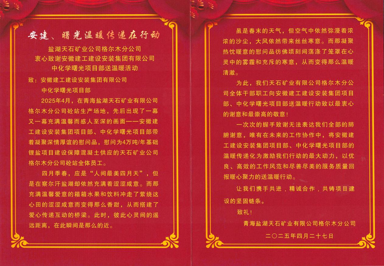 信中,青海鹽湖天石礦業(yè)有限公司格爾木分公司對建工安裝項目部此前慰問砼站全體員工致以最誠摯的感謝,愿繼續(xù)與建工安裝項目部攜手共進(jìn)、精誠合作、再創(chuàng)佳績!這封感謝信不僅是對項目部過往成績的肯定,更是一份振奮人心的激勵。建工安裝將繼續(xù)保持高昂斗志和嚴(yán)謹(jǐn)態(tài)度,加強(qiáng)與相關(guān)單位溝通協(xié)作,強(qiáng)化項目管理,確保項目按期、高質(zhì)量交付,為打造世界級鹽湖提鋰產(chǎn)業(yè)基地貢獻(xiàn)力量!