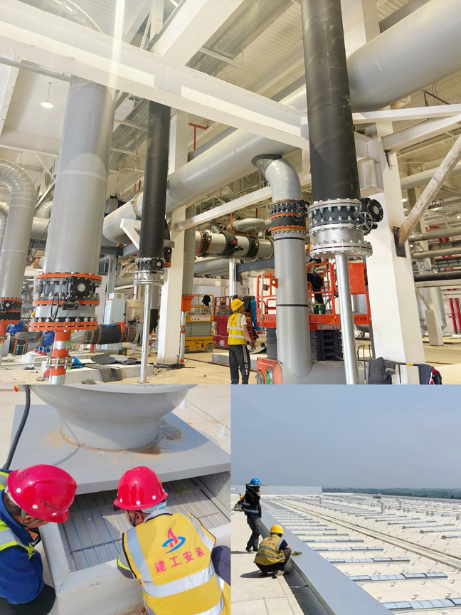 圖為新橋智能制造產業園項目部冷凍水管道保溫、屋面風機調試、TPO屋面防雷接地施工