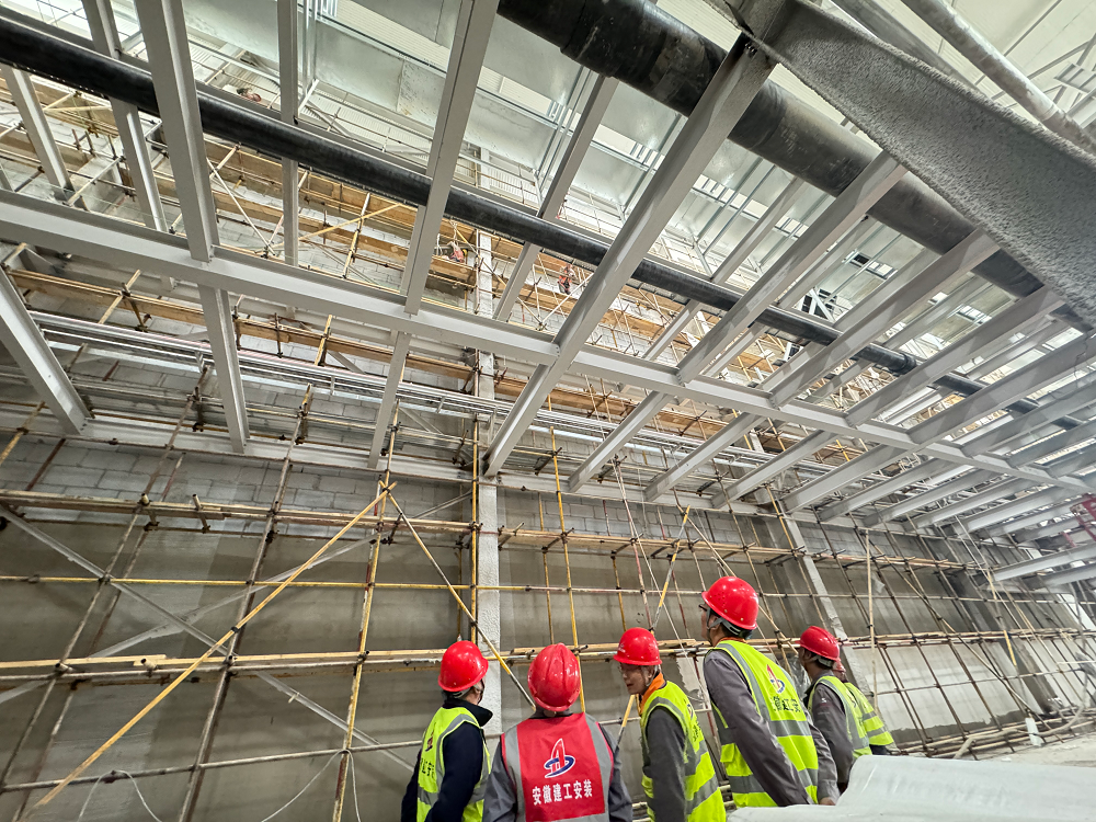 青海高原,氣候惡劣,環境艱苦,高寒缺氧,但這些困難并沒有阻擋項目部全體成員奮斗的步伐。施工現場,機器轟鳴聲此起彼伏,工人們頭戴安全帽,身系安全繩,操作著各種設備,熟練地進行著防水卷材敷設、吊頂板安裝、鋼筋綁扎、外墻抹灰、風管安裝等作業,每個環節都緊張有序,環環相扣。項目管理人員穿梭在各個施工點,緊盯現場安全與質量,及時協調解決施工中遇到的問題,他們全身心地投入到工作中,用專業的素養和嚴謹的態度為項目建設保駕護航。