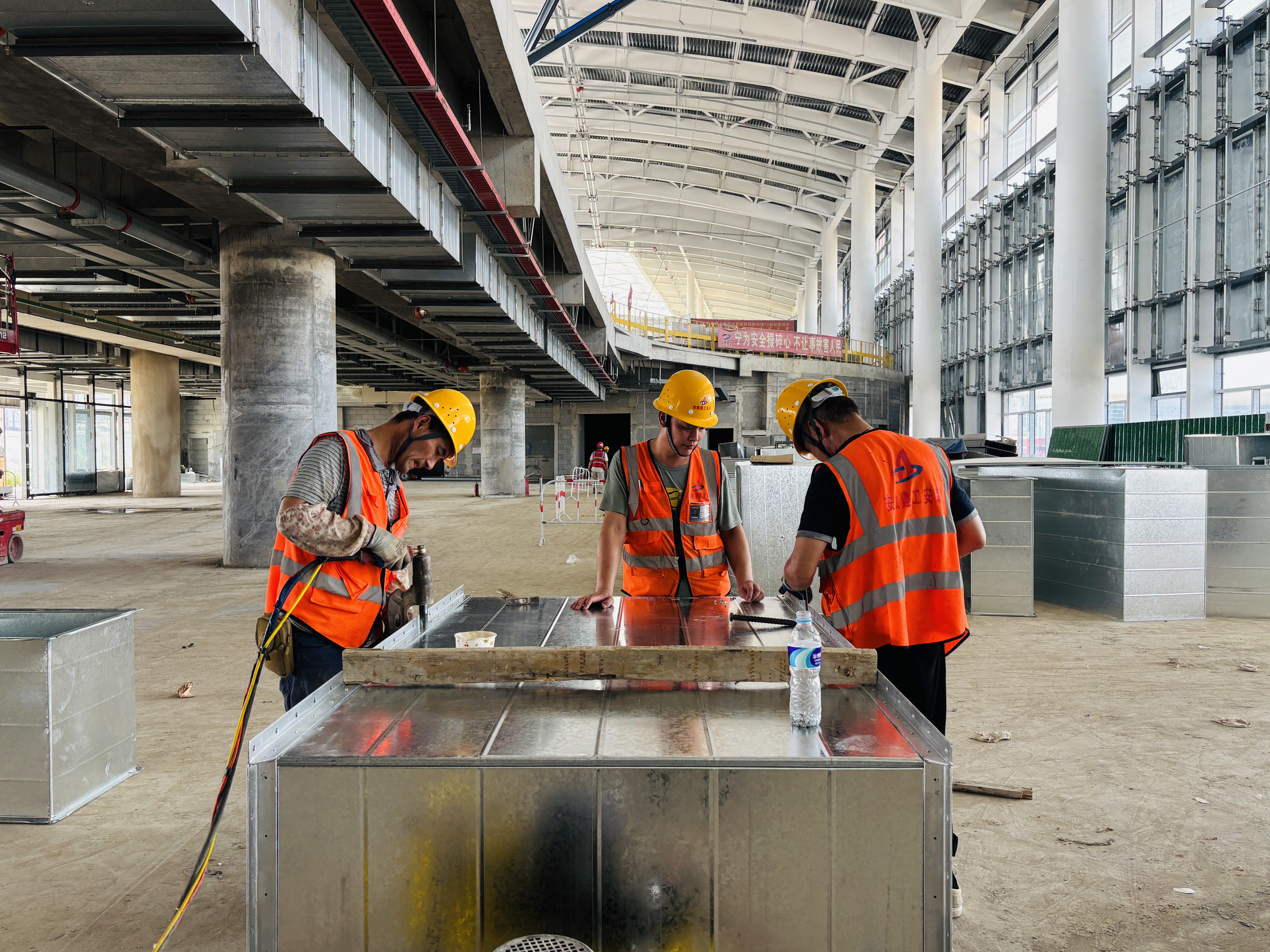 急難險重之處,黨旗始終高揚。項目部成立“機電攻堅黨員突擊隊”,黨員帶頭負責最復雜區域的安裝任務;青年技術骨干組成“創新攻關小組”,成功優化超高大空間風管提升方案,效率提升30%;面對持續高溫天氣,后勤保障組推出一系列防暑降溫舉措,科學調整作息、物資保障到位、改善作業環境、健康關懷升級,為一線建設者撐起“清涼傘”。